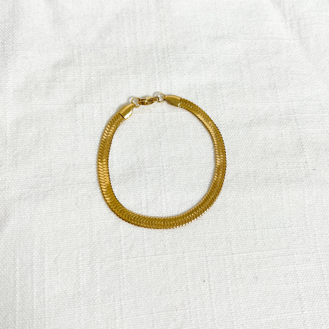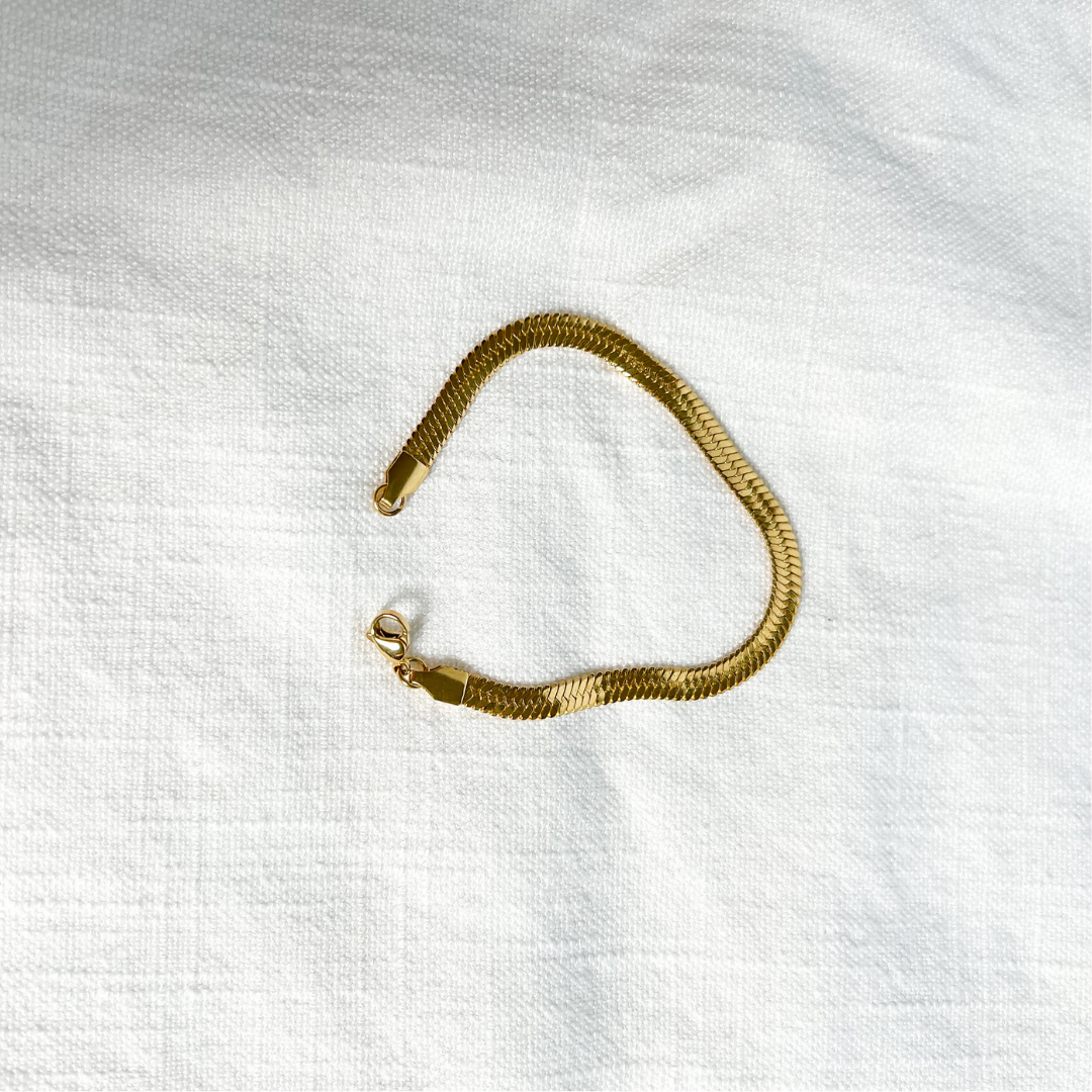 Gold Herringbone Bracelet on white linen background
