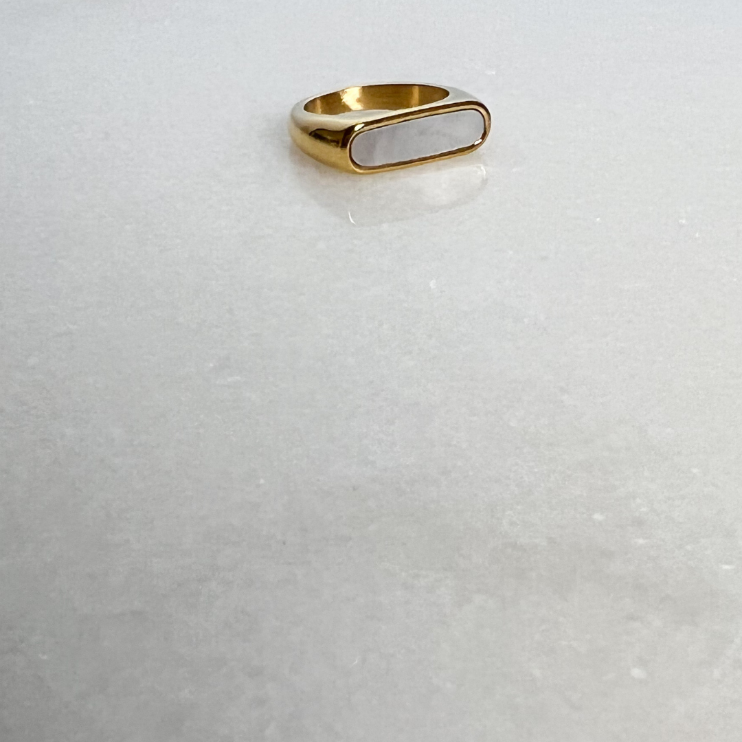 Gold signet ring with white enamel on marble background
